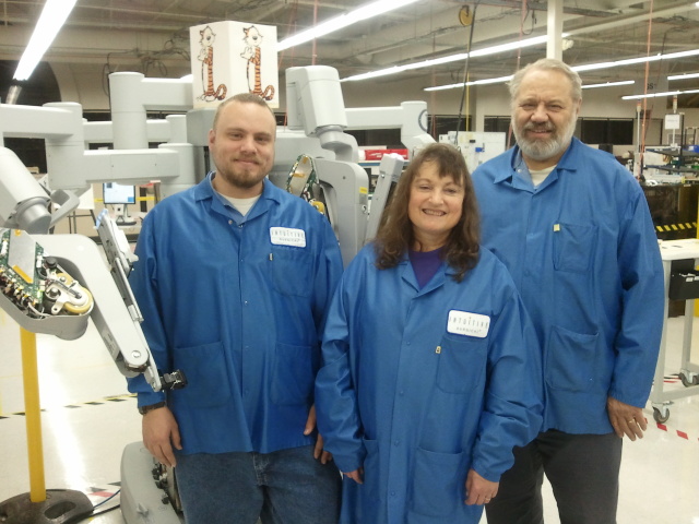 That's us standing in front of a da Vinci surgical robot wearing officialIntuitive Surgical Smocks. We got to control one of them personally, but Iended up killing the patient. |